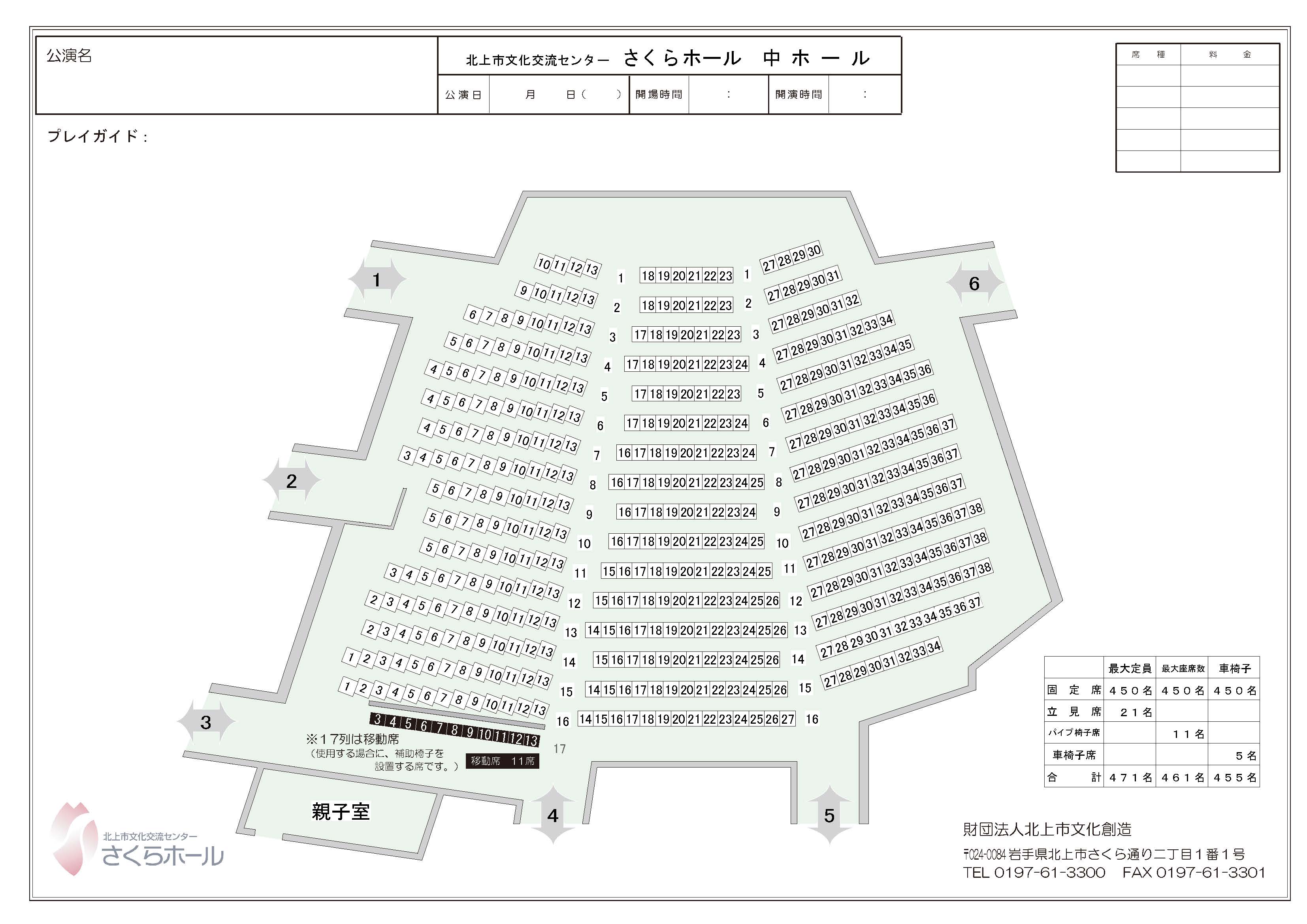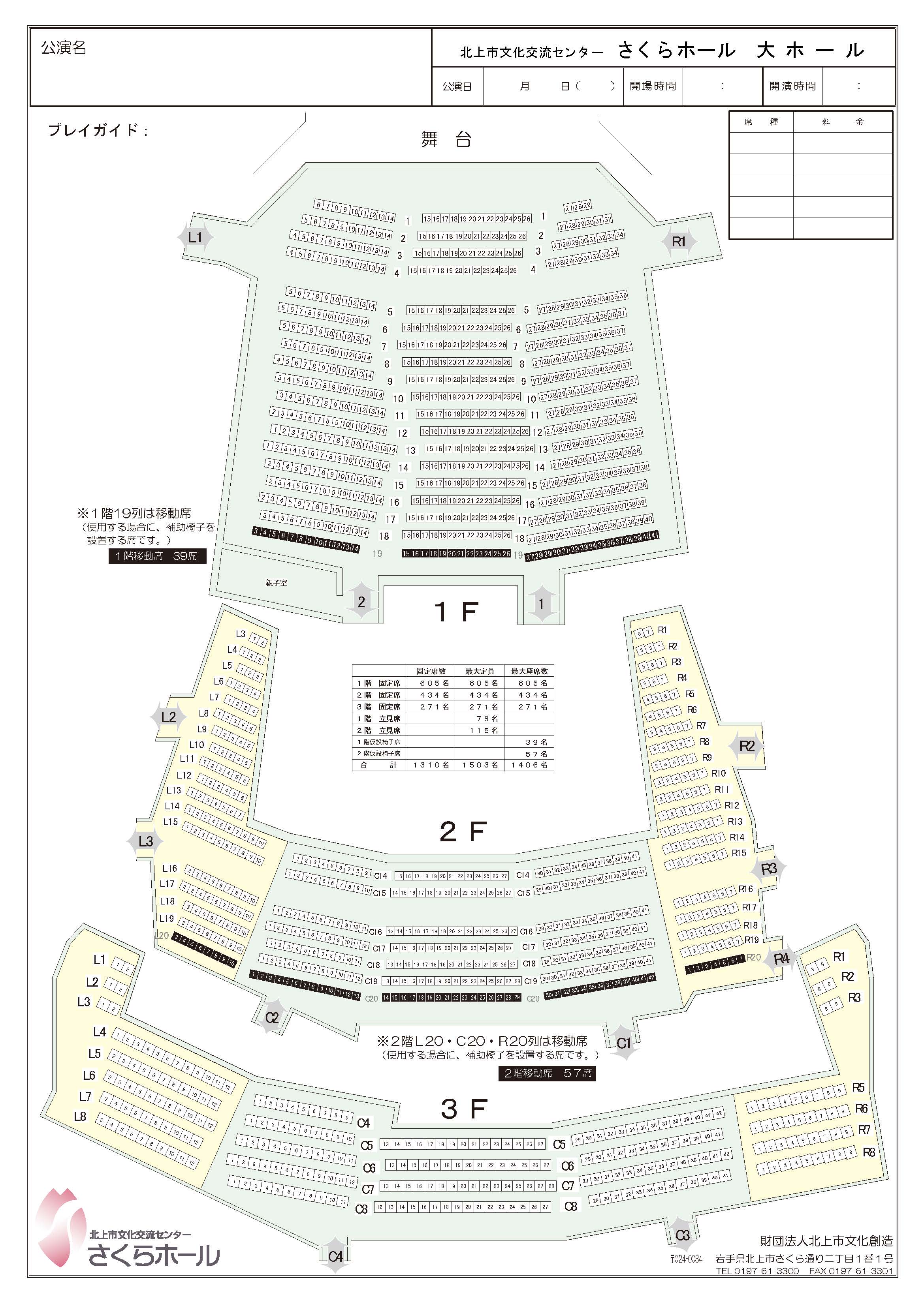 ※大ホールの1F19列目、2F20列目は移動席になりますのでご使用の場合は仮設イスを設置する作業が伴います。※中ホールの17列目は移動席となりますのでご使用の場合は仮設イスを設置する作業が伴います。