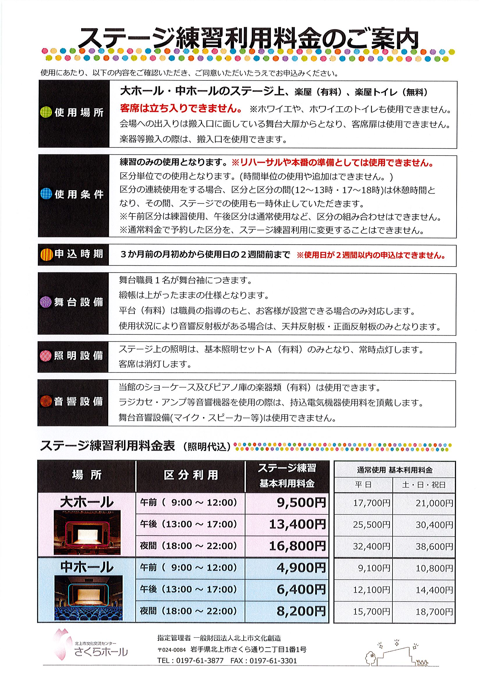 | 練習料金(ステージのみ使用) | 8,300円 | 12,200円 | 15,600円 |