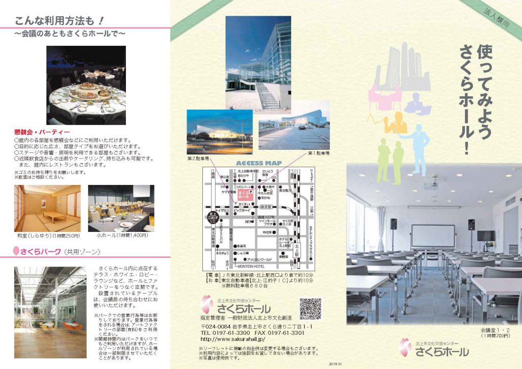 ・アクセスの良さと、電話1本で予約や空室状況確認ができる手軽さで、会議の手配を効率よくサポートします。 ・680台の無料駐車場完備 ・北上市江釣子I.C.から約10分のアクセスの良さ ・1時間単